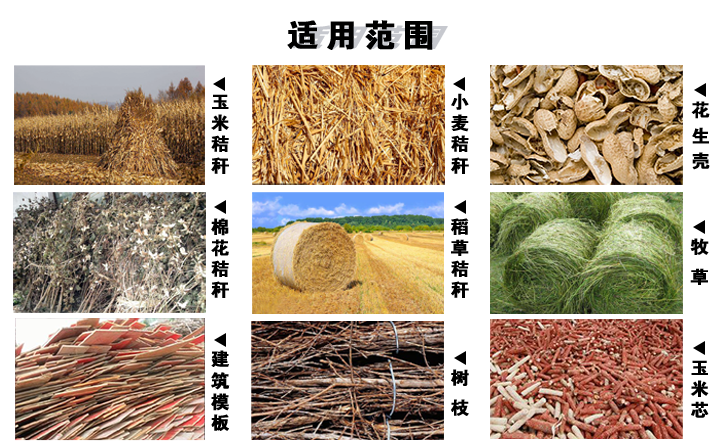 - 加工原料: 秸稈、木屑、稻殼、花生殼、建築模板等